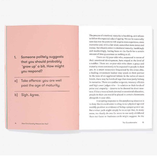 No matter your age, you might be surprised at how much emotional growing you could still benefit from doing. With a gently thoughtful questionnaire and insightful accompanying essays, this book guides you through challenging how you respond to rejection, anxiety, frustration, hope, and encourages you to reach a deeper sense of maturity and attain your full potential of self-awareness.