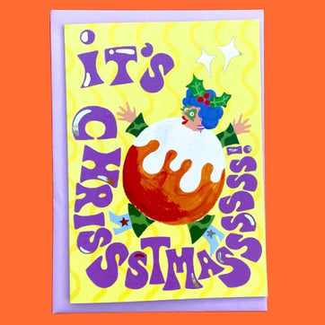 IT'S CHRISSSTMASSSSSS! Celebrate the festive season with this fun and colourful card. The design shows a lady dressed up as a Christmas pudding and is blank inside for your own message.
