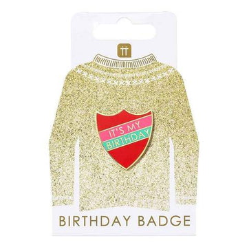 Make someone's day with this fun eye catching enamel prefect's badge that says 'it's my birthday' in bright colours and gold detailing. Comes on a card backing in the shape of a jumper.