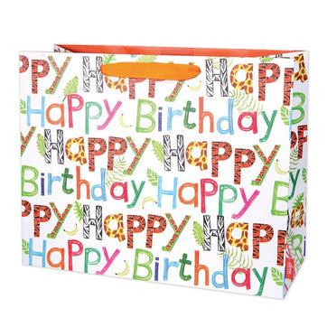 A large bright and cheerful jungle themed gift bag with the text 'Happy Birthday' repeated in a pattern across. This bag also features lovely orange ribbon handles.