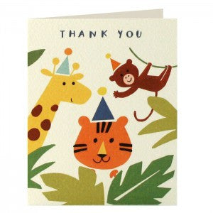 A pack of five high quality notecards illustrated by Ekaterina Trukhan and printed on textured cream board. The image shows a giraffe, lion and monkey wearing party hats in the jungle.The message on the front of the cards is ‘Thank You’.