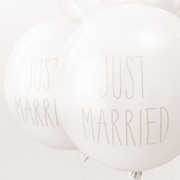 Just Married Pack of 12 Balloons made of natural rubber latex. They are 30cm in size. This mix of white balloons have Just Married printed on them.