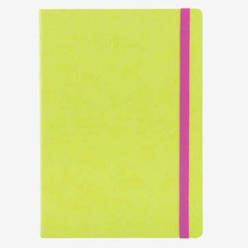 This high-quality notebook from Italian stationery designer Legami has 192 blank pages - ideal for notes or sketching. It includes a 12-page monthly planner, address book section, password pages, and archive pocket for loose pages. The cover is made from a soft PU leather, along with elastic closure and pen holder. This design features a funky lime green softcover with magenta elastic closure.