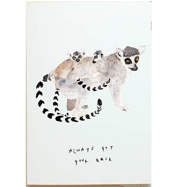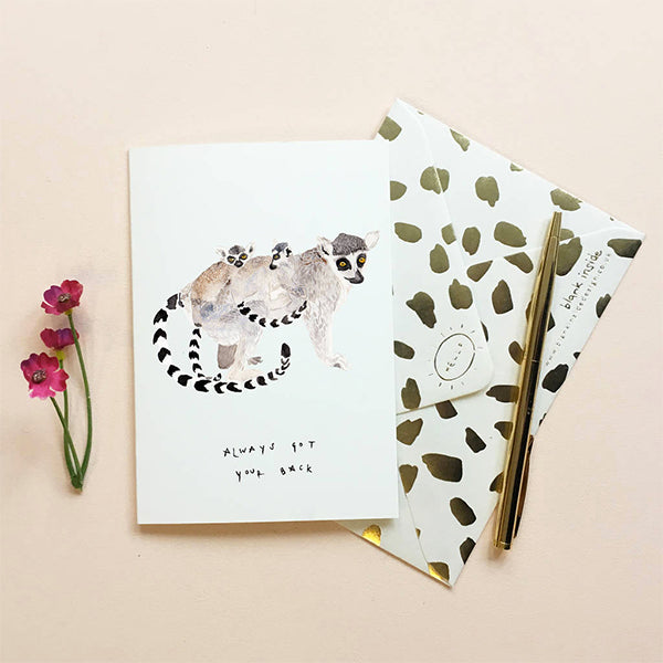 Got your back lemur Mother's Day eco friendly card. This mother's day card is blank inside, printed onto ecological ‘tree free’ annually renewable plant fibre cream paper and comes with a gold foiled envelope, made from upcycled coffee cups.