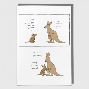Where is your wallet, i want to go buy you a mother's day present? Sound familiar. This Mother's Day card is blank inside and comes with a grey envelope.