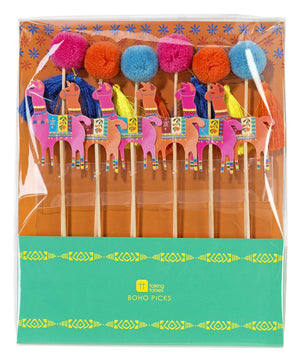 A pack of 12 fun drinks picks, topped with llamas and pom poms. Perfect for any cocktail!
