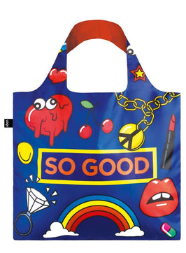 So Good on one side, Very Nice on the other. This bag is a positive affirmation as well as a super cool pop print water-resistant sturdy reusable bag.