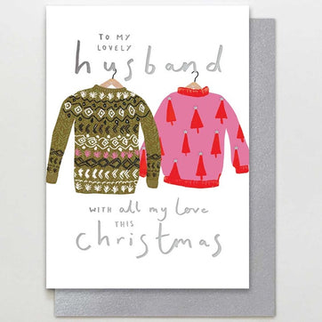 To my lovely husband with all my love this Christmas. Let your partner know how much you love them this festive season. This silver foil Christmas card is blank inside, printed on forest friendly paper and comes with a bright and shiny silver envelope.