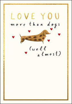 This adorable Valentine's day card is ideal for for the dog enthusiast in your life. It features a sweet illustration of a sausage dog and reads 'love you more than dogs (well almost)' - romantic but honest! Comes with matching envelope.