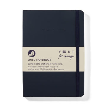 Vent for Change is a UK based company creating beautiful sustainable stationery and supporting children's education projects worldwide. This notebook has a soft recycled leather cover in navy blue, debossed with the phrase 'make a mark', and has 192 pages of lined off-white paper made from sustainable sources. With elastic closure.