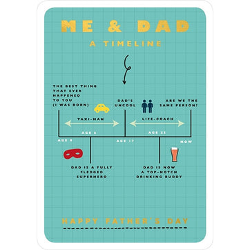 Me and Dad a timeline. A die-cut golf foil timeline that illustrates how eventually you become your Dad. This fathers day card is blank inside, is printed on 280gsm textured card and comes with a quality kraft envelope.