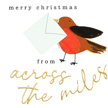 Merry Christmas From Across The Miles. A festive robin carries a Seasonal message of .good cheer to loved owns far from home. This gold foil embossed Christmas card is blank inside, is printed on Forest Friendly card and comes with a quality Kraft brown envelope.