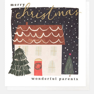 This delightful card captures the quintessential winter scene: a cosy house nestled amongst festive fir trees, all dusted with sparkling snow. The front is elegantly finished with the heartfelt message, 'merry Christmas wonderful parents' highlighted by luxurious gold foil lettering and subtle embossing for a premium touch.