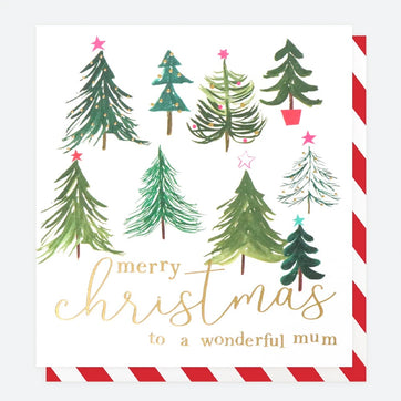 This year, send the perfect Christmas message inside the perfect card. This environmentally conscious card features a selection of beautiful Christmas trees with the words 'Merry Christmas to a wonderful mum' printed in gorgeous gold on the front. Made complete by the candy-cane coloured envelope, this card has the message 'merry christmas and a happy new year' printed inside with plenty of space for your own personalisation.