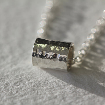 This stunning minimalist necklace features a small silver tube, hammered and gently polished for a beautiful texture. It is handmade by Glasgow-based designer Rachel Rogers. An elegant accessory for any occasion.