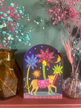 This beautiful die-cut card features a sweet illustration of a Leopard wandering through colourful trees. Blank inside.