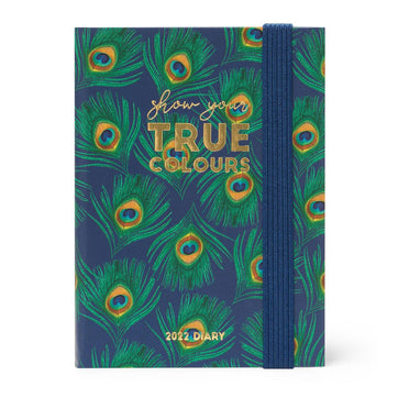 Express yourself with this beautiful peacock themed mini weekly hardcover 2022 diary! Each week is split across two pages, so you can see what you're doing at a glance. Includes a holiday planner, international holidays, an address book and a January 2023 monthly planner. Keep tidy with an elastic closure, ribbon bookmark and perforated corners to tear off at the end of each week to make it easier to find today's date.