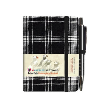 This gorgeous notebook made by Waverley Books features a tartan fabric cover in the Kinloch Anderson black and white design. Comes with a matching retractable pen and an elasticated closure.