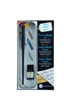 Calligraphy pen and ink set complete with 3 nibs and a pot of black ink, in a charming silver pen tin.