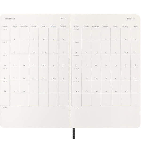 Crafted with the iconic Moleskine quality you rely on, this diary features a soft, yet durable cover debossed with the year '2026', gently rounded corners, a matching ribbon bookmark, and the reassuring snap of the elastic closure. Inside, the ivory-coloured, 70 g/m² acid-free paper is a pleasure to write on, welcoming fountain pens and pencils alike.
