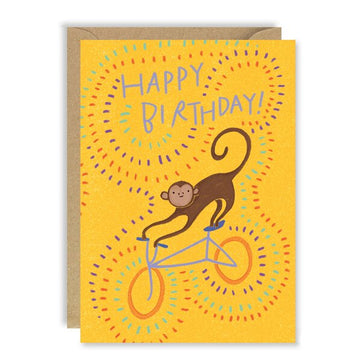 A bright and cute birthday card illustrated by Joy Nevada, featuring a wee monkey on a bike, sending cheer on someone's special day.