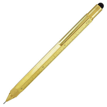 Monteverde's One Touch Tool Pen is a ruler, a screwdriver, a capacitive stylus and, a pencil. After all, who doesn't wish that their ruler/screwdriver was also a pencil? Special premium brass finish has the look of a quality old tool. The finish is intentionally left a little imperfect. A thin lacquer coating helps reduce oxidation, but may well wear off with time and use, giving a more aged look.