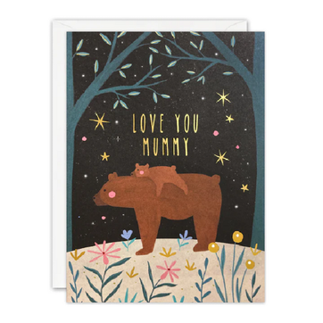 A sweet Mother's Day card illustrated by Bea Müller featuring a little baby bear lying on its mother bear's back, surrounded by trees and flowers and a starry night sky. Elements within the design are foiled in gold.
