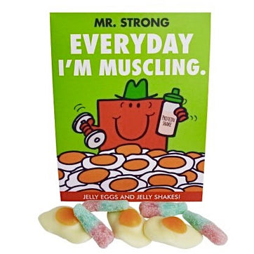 Presented in a a-frame box these fried egg and shakes shaped jellies are perfect for keeping you strong!* Inspired by Mr Strong, they are sure to please anybody with a sweet tooth!