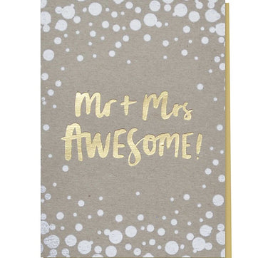 Mr And Mrs Awesome card printed on 100% recycled grey board and finished with a satin gold foil. This UK made wedding card is blank inside and comes with a gold envelope.