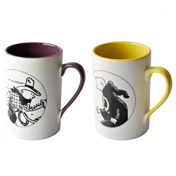 Two bright and colourful porcelain mugs, one with an American Cowboy dressed Tintin on a horse and one with Tintin in a toga.