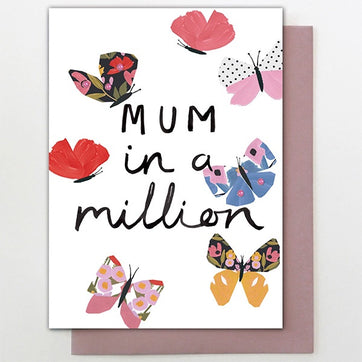 Mum in a million. This multi-coloured butterfly Mother's day card is hand finished with sparkly gems, blank inside, is printed on luxury card and comes with a dusky pink envelope.
