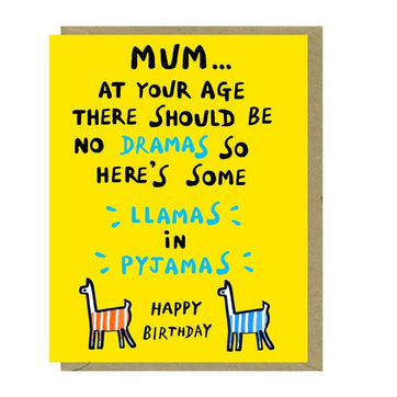 Wish your Mum a drama-free birthday with this fun card by Earlybird featuring Llamas in pyjamas! Enhanced with a UV finish, this card was designed and printed in the UK using sustainable papers and inks. Supplied with a recycled kraft envelope.