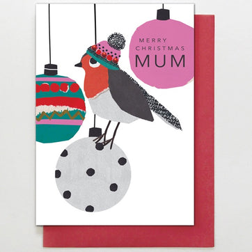 Merry Christmas Mum. Let her know you are thinking of her this Christmas with this cosy hat wearing robin with a sparkly gem hand finished christmas pattern. This christmas card is blank inside, is printed on luxury card and comes with a red envelope.
