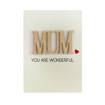 This cool Mother’s Day card features a wooden lasercut ‘MUM’ on the front, making it sure to stand out on the day!