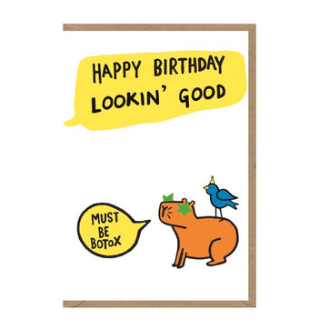 This funky neon birthday card features a stylish capybara in green star-shaped sunglasses. A fabulously fun card for a loved one's birthday!