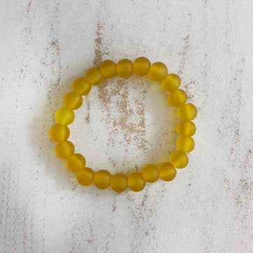 These colourful bracelets are a collaboration between UK designer Laura Queening and artisans in Nepal working in association with the Napal Leprosy Trust - providing career opportunities for marginalized communities. The beads are made from recycled glass (crushed bottles and jars) and are bound together by a sturdy elasticated band. An eye-catching and stylish accessory in a cheerful yellow colour.