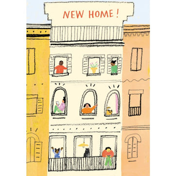 Celebrate their fresh new start with this lovely and bright, sketched-style card. Featuring a bustling block of flats with friendly neighbours, this design is bold in warm tones of yellow and peach.