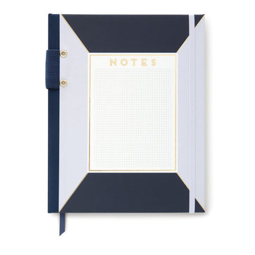 This elegant planner has a hardcover with pen holder attached, featuring a sleek geometic andgrid design with gold font. Inside there are 192 lined pages along with day month and year headers.