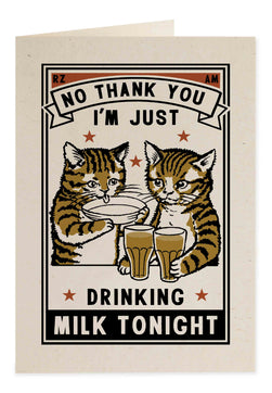 This quirky card reads 'no thank you I'm just drinking milk tonight' alongside two striped cats - one with a beer in his paw and the other with a saucer of milk. The perfect card for a designated driver! It is printed on a vintage windmill letterpress - giving it a wonderful retro vibe.