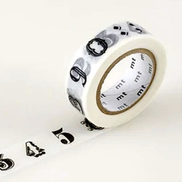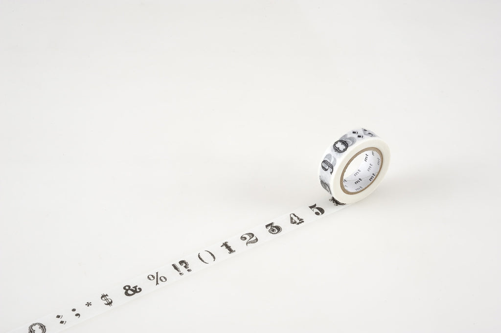 MT washi tape is a patterned tape, inspired by Japanese stationary, used for crafting and decoration. This black and white design features numbers and symbols in a vintage font.