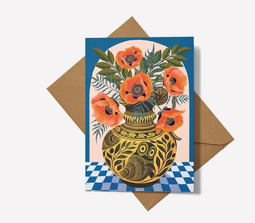 A gorgeous card for everyday writing featuring illustrated red poppies in an Oenochoe vase. Blank inside for your own message.