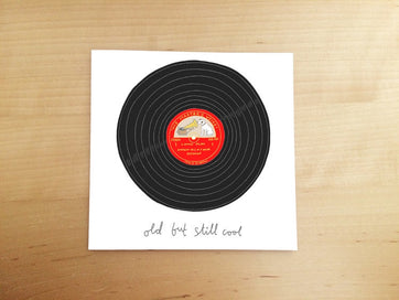 This cheeky birthday card reads 'old but still cool' alongside a funky illustration of a vinyl record. Perfect for the friend that still has the moves! Blank inside for your own message.