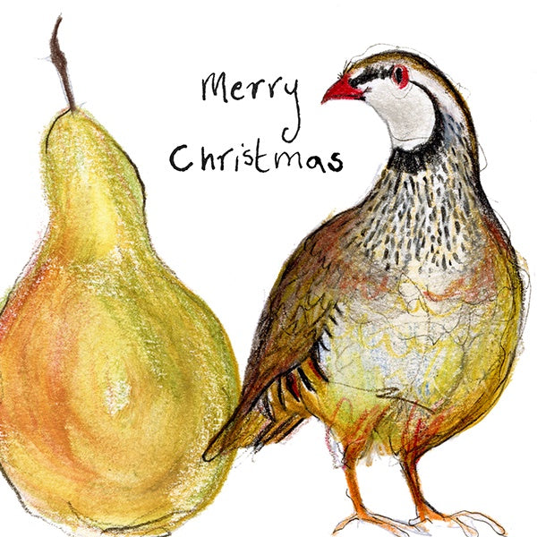 Merry Christmas. Send someone the traditional pairing of a partridge and a pear this Christmas with this beautifully illustrated card by Edinburgh based artist Catherine Rayner. Featuring an elegant partridge with a pear, this christmas card is printed on heavy watercolour card and has been left blank for your own message.