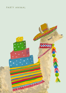 A whimsical birthday card featuring an illustration of a llama. This card has been left blank inside for a personal message and it comes with a brown envelope.