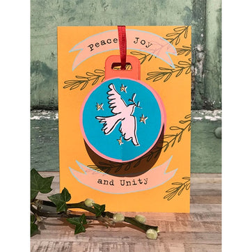 This Christmas pop-up bauble card holds a promise of Peace, Joy and Unity to decorate your home with. The Christmas card is blank inside and comes with a red satin ribbon and a Forest Friendly cherry red envelope.