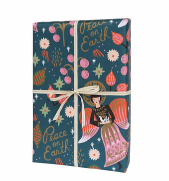 This is a sheet of beautiful Christmas wrapping paper featuring an angelic design. Add a matching bow for an extra special touch.