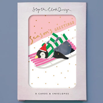 Season Greetings. These gold-foiled Christmas cards show a striped scarf wearing penguin sledging at speed down the snowy slopes. Blank inside for your personal message, they're printed on eco-friendly card and come with red envelopes.