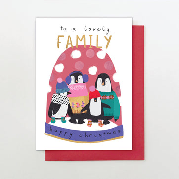 One for all the family, this card illustrated with fun loving penguins in a snowgloble is a lighthearted but adorable way to send your love to all this Christmas.