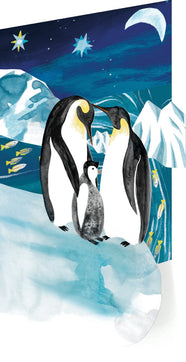 This lovely laser cut Christmas card features a festive penguin family illustration. A sweet way to send your season's greetings!