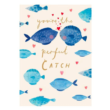 This lovely, watercolour-style illustrated card, finished with sparkling touches of gold foil and embossed lettering, features two loved up fish, sure to make your significant other blush.